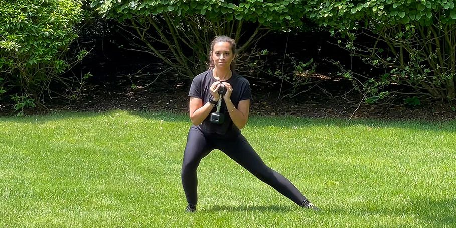 How to do it: Stand with feet together and use both hands to hold a dumbbell or kettlebell in front of chest. Take a large step to the left and, keeping back flat and chest up, push hips back as you bend left knee into a lateral lunge. Push through left foot to stand back up. Repeat for 10 reps, then switch sides. Perform 3 sets.
