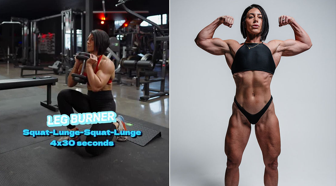 To replicate her reps, you’ll perform a heel elevated goblet lunge, then step back, and drop into a goblet squat. Be sure to count the lunges, completing a total of 6 to 10 rounds of this combo for 2 sets with each leg.