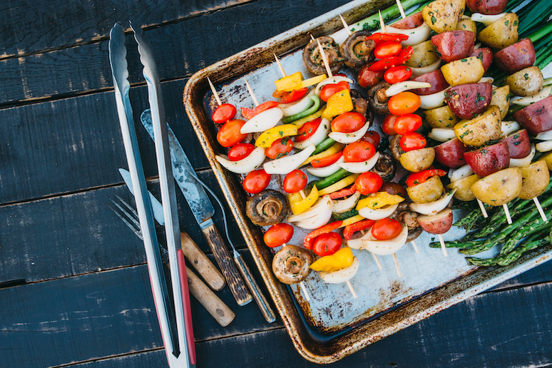 And while the grill is already stoked and hot, why not toss on some produce? Bell peppers, asparagus corn, summer squash, red onion and tomatoes all char up nicely over an open flame (or on a gas grill) and can easily be transformed into enticing rainbow skewers. These are all excellent options for any vegans, vegetarians or as an option for someone who wants an alternative to animal protein that day.